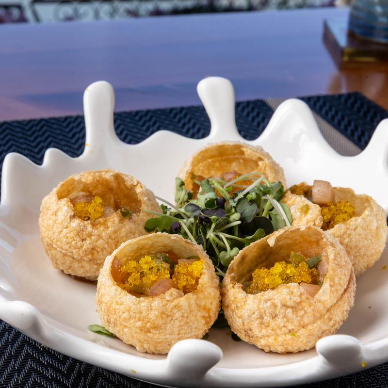 Crispy Rice Wafer topped with minced fatty tuna, pickled daikon, and salmon roe